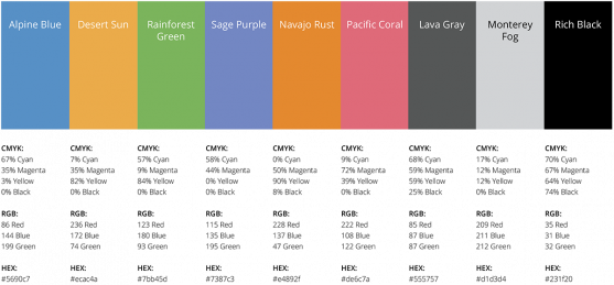 Use the formulas below to accurately reproduce the colors included in the palette. Use the CMYK formula for color printing, RGB or hexadecimal for the web and video.