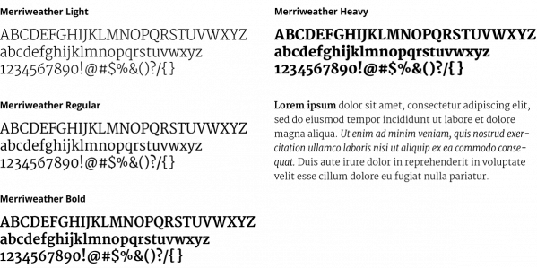 Merriweather is a serif typeface that has a more traditional feel. It is also very legible when set in long columns. Use Merriweather for magazines, books, and other long documents or for publications that require a more traditional presentation.