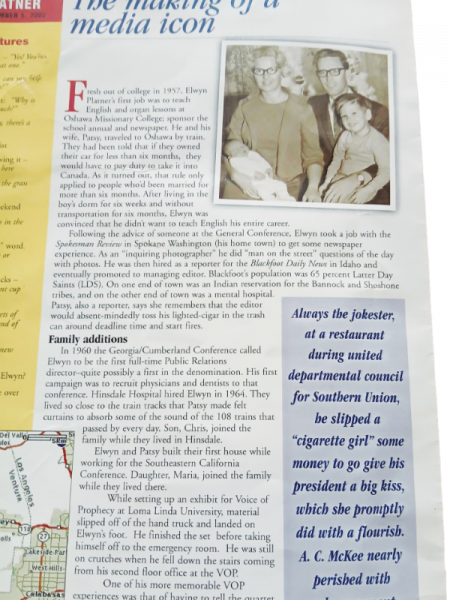 Over the years, Elwyn did communications work for Hinsdale Hospital near Chicago, Southeastern California Conference, Voice of Prophecy, Walla Walla University, and Oregon Conference before settling long term in Simi Valley, California, while editing the Recorder.