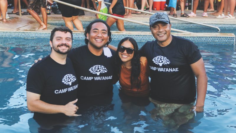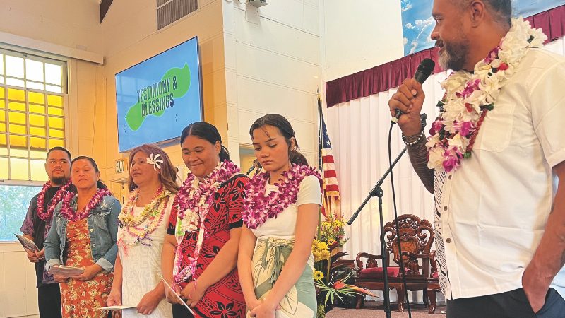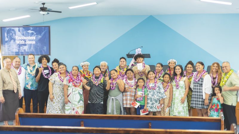 (También español) November 11, 2023, was a day of spiritual transformation for the Kaneohe church. In the presence of over 200 family and friends, five individuals took the plunge in the church’s “Blue Papaya” baptistry.