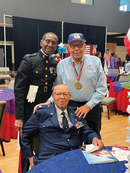 Marine Chief Warrant Officer Franklin Benjamin (top left), Air Force Colonel Ralph Smith (top right), and Air Force Lieutenant Colonel William Howe (seated), all retired, gather for the NAACP luncheon.