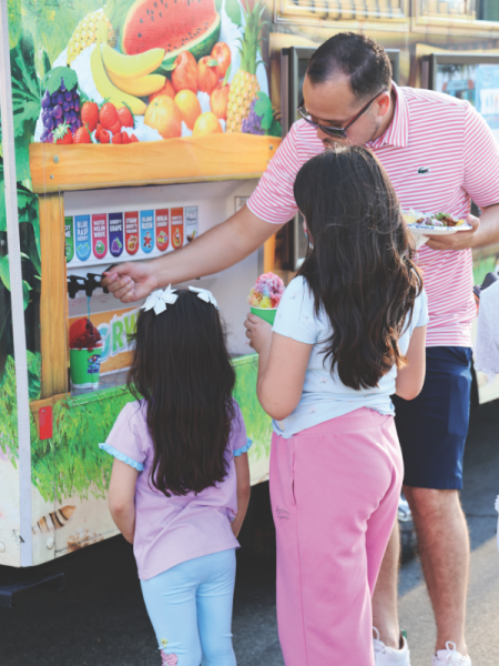 To beat the summer heat, families lined up for Kona Ice, savoring refreshing shaved ice in a rainbow of flavors. Delicious food stations provided plenty of options to enjoy a picnic-style dinner on the lawn, where groups gathered under the fading sunset to share stories and the simple joy of being together.