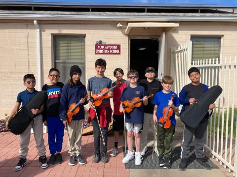 The Yuma Adventist Christian School orchestra is comprised of the students in grades five through eight, and this is the first year for the group to be practicing and performing. The ten violins, two cellos, and one viola fill out the group, which meets every Wednesday for music class.