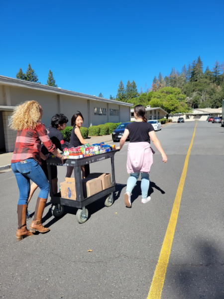 Throughout the school year, on the first and third Thursday of each month, the highschoolers from PUC Prep have shown up to help with unpacking the Angwin food bank deliveries. They stock the shelves with canned goods, rice, beans, and more. The highschoolers brainstorm ideas on how to expand the pantry and create more space. The students have done an excellent job—from maneuvering and storing pallets full of heavy boxes to organizing and hanging clothing on racks for distribution.