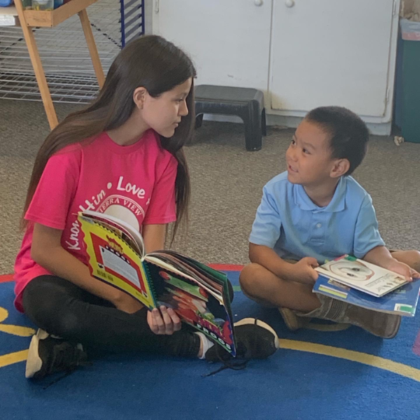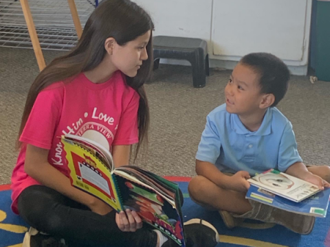 On the Fridays that ninth graders are not serving at the food pantry, they partner with eighth graders to read with their kindergarten reading buddies. These reading buddies provide positive connections between age groups, foster a joy of helping others, and create a love of reading!