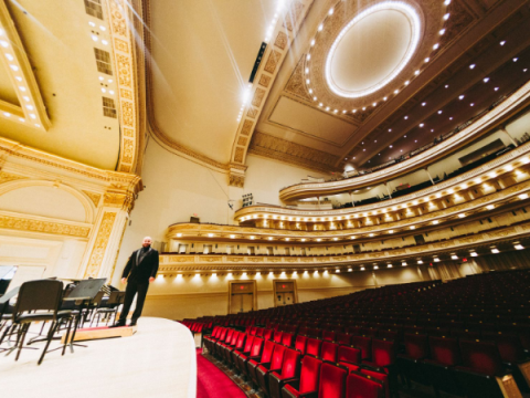 Giovanni Santos poses on Carnegie Hall's famed stage in 2018 prior to the La Sierra University Wind Ensemble's performance. (Photo: Natan Vigna)