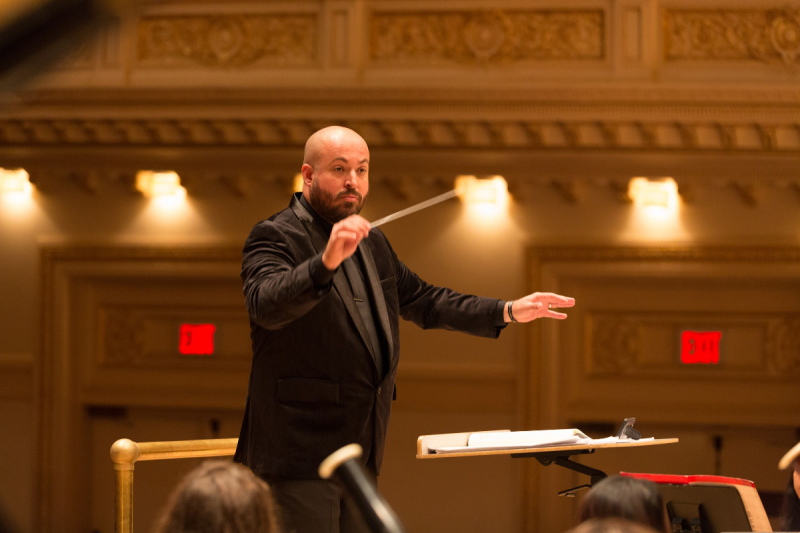 Giovanni Santos rehearses the La Sierra University Wind Ensemble on stage at Carnegie Hall in 2018 just before their performance. (Photo: Natan Vigna)