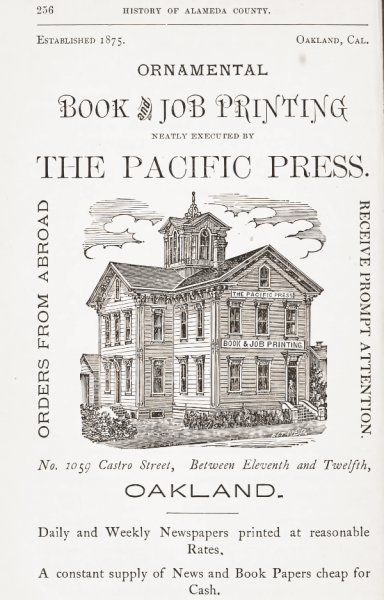 April 1, 1875, the Pacific Seventh-day Adventist Publishing Association was formed in Oakland, its capital stock being fixed at $28,000. The central portion of the lots on Castro St. was, according to agreement, deeded over to the association, and a building was at once constructed by O. B. Jones, of Battle Creek, Mich., the form and size of which was the same as that of the office erected in Battle Creek, except that the one in Oakland was constructed of wood instead of brick. This building being ready for occupancy, the Signs of the Times was moved into its new quarters on Friday, Aug. 27, 1875. 2