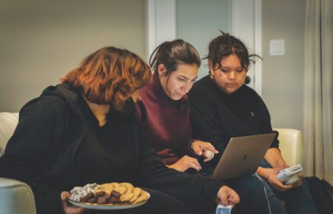 While Abbie and Toni settle in, another member of the family, Dalariyn, is back on campus at the gym watching the home basketball game. She had already informed her faculty mom that she would be missing today’s get-together at the house, which is an almost daily custom for this particular family. Abbi, Toni, and Ms. Newhart grab the snacks from the kitchen and settle in on the living room couch as they look over matching Christmas-themed pajamas for their family holiday photo.