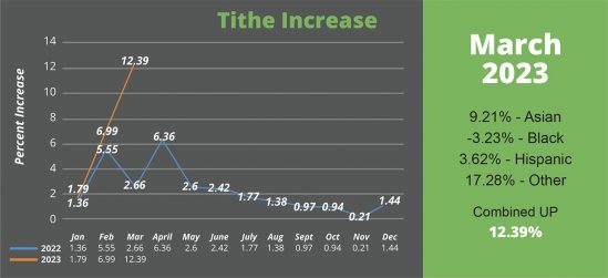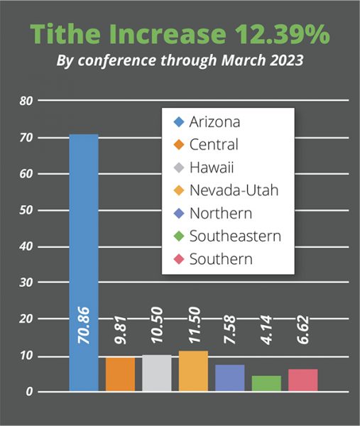 Las lecciones de Escuela Sabática del primer trimestre se centraron en diezmar y ofrendar, recordándonos que debemos reconocer las abundantes bendiciones del Señor y devolverle con fe lo que de hecho es suyo. En general, nuestra unión continúa aumentando en ese sentido. El tesorero, Stephen Mayer, informó un aumento del diezmo del 12.49%, señalando que cada conferencia dentro de la unión tuvo un aumento. Esa tendencia es similar al aumento general de la División Norteamericana. «Un pequeño aumento del diezmo sería un milagro en este entorno económico», dijo Mayer. «¡Pero tener aumentos de dos dígitos solo puede explicarse como bendiciones del Señor! Los fondos nos permiten ayudar a nuestros empleados a poder permitirse financieramente difundir el evangelio en la Pacific Union».