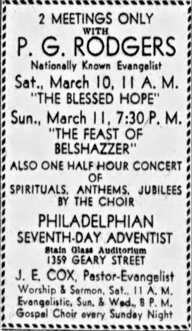 Rodgers’ ministry was not restricted to the Black community. He served on the Southern California Conference executive committee from 1927-1937 and was frequently a featured speaker at camp meetings and other conference-wide gatherings. He also lent his preaching and the music of his renowned choir, for which he appropriated the name Jubilee Singers, in support of the efforts of leading white evangelists, such as H.M.S. Richards Sr. and Philip Knox.