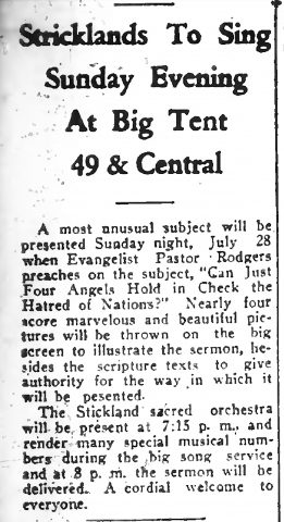 In the summer of 1924, Rodgers set up the 1,000-seat Big Gospel Tent on Central Avenue in the heart of the Black community for three months of evangelistic meetings. This would become an annual, summer-long happening for most of the next 15 years. The 1924 campaign drew near-capacity crowds on Sunday nights and 400 to 600 on weeknights, including sizable contingents of white people. The church membership doubled to 200 as a result, making it clear already that a larger church building would be necessary.6