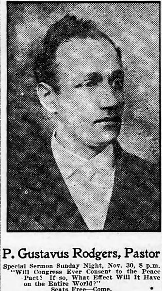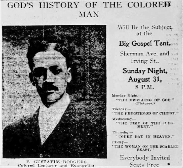 Nacido en Filadelfia, Pensilvania, el 10 de agosto de 1885, Gustavus Rodgers fue el único converso resultante de las reuniones evangelísticas dirigidas por Fred H. Seeney en Wilmington, Delaware, en 1908. Gustavus y Alverta, casados en 1906, tenían raíces en el pueblo de Delaware de ambigua herencia racial conocido como los «moros».2 La tez clara de la pareja a veces confundía a la gente. Cuando, por ejemplo, llegaron a Los Angeles en 1923, sus feligreses reaccionaron con sorpresa, pensando que la conferencia había enviado a un blanco para que fuese su pastor.3 Sin embargo, no había nada ambiguo sobre su identidad como negros o sobre su dedicación al avance racial.