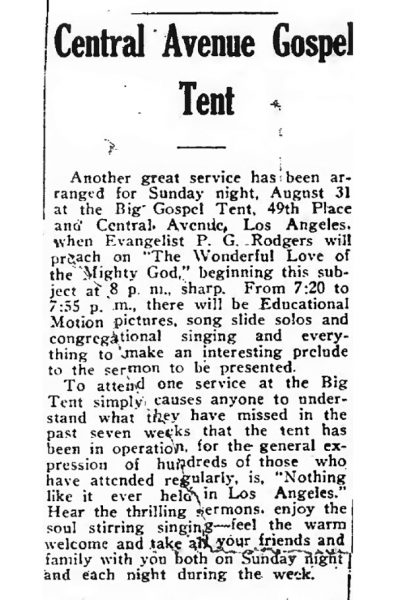 En el verano de 1924, Rodgers instaló la Gran Carpa del Evangelio con capacidad para 1.000 personas en Central Avenue, en el corazón de la comunidad negra, durante tres meses de reuniones evangelísticas. Eso se convertiría en un acontecimiento anual durante la mayor parte de los próximos 15 años. La campaña de 1924 atrajo multitudes los domingos por la noche y de 400 a 600 personas entre semana, incluyendo contingentes considerables de personas blancas. Como resultado, el número de miembros de la iglesia se duplicó a 200, lo que ya dejaba claro que sería necesario un edificio más grande para la iglesia.7