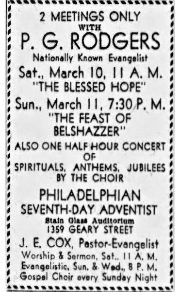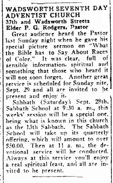 El Dr. H. Claude Hudson, presidente de la sección de Los Angeles de la Asociación Nacional para el Progreso de las Personas de Color (NAACP), y Charlotta A. Bass, editora del California Eagle, el principal periódico negro del sur de California, estuvieron entre los oradores invitados a la Iglesia Adventista del Séptimo Día de Wadsworth el 7 de enero de 1931. Estaban ahí para celebrar el vigesimoquinto aniversario de bodas del pastor de la iglesia, P.G. Rodgers, y su esposa, Alverta Durham Rodgers, y «para felicitar a la iglesia por los rápidos avances que ha logrado bajo el liderazgo del pastor Rodgers».1