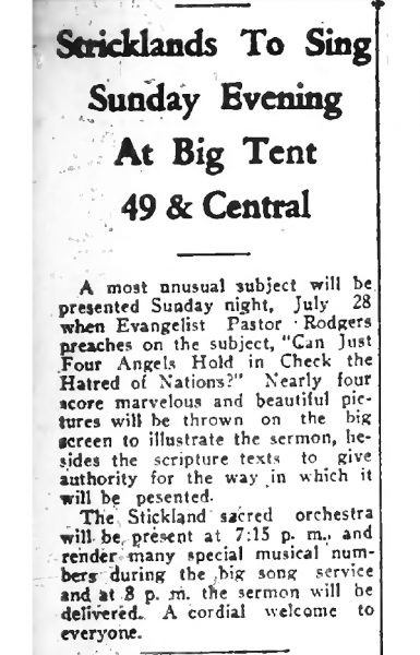 In the summer of 1924, Rodgers set up the 1,000-seat Big Gospel Tent on Central Avenue in the heart of the Black community for three months of evangelistic meetings. This would become an annual, summer-long happening for most of the next 15 years. The 1924 campaign drew near-capacity crowds on Sunday nights and 400 to 600 on weeknights, including sizable contingents of White people. The church membership doubled to 200 as a result, making it clear already that a larger church building would be necessary.7