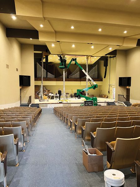 Phase one included a new lighting system that replaced the interior lights and a light bar above the stage. Phase two will begin in early August. The music department is offering the opportunity to name and personalize seats in the new theater for donations of $250 per chair.