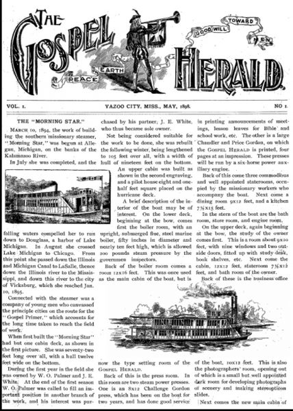 At the height of this "Second Redemption" of the nineties, Edson White tried to implement the comprehensive plans for the South proposed earlier by his mother. Having read some of his mother's appeals, Edson responded by constructing a 70-foot steamboat, the Morning Star, and sailing it down the Mississippi River. Arriving in Vicksburg, Mississippi, Jan. 10, 1895, Edson made the Morning Star a floating headquarters (complete with chapel and print shop) for publishing, evangelistic, educational, and agricultural work among Mississippi Black people.