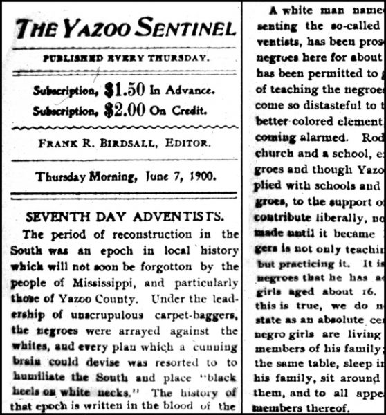 Hace dos semanas, esta noche, una turba de unos 25 hombres blancos llegó a nuestra iglesia en Calmer alrededor de la medianoche. Sacaron al Hermano Stephenson, nuestro obrero, y después saquearon la iglesia, quemando libros, mapas, gráficas, etc. Buscaron al hermano Casey, nuestro principal hermano de color de ese lugar, pero había escapado a tiempo, así que no lo alcanzaron. Después fueron a la casa del hermano Olvin, lo llamaron y lo azotaron con un cuero de vaca. Creo que lo habrían matado si no hubiera sido por un hombre blanco amistoso que les ordenó que dejaran de azotar después de haberle dado algunos golpes. Al principio no le prestaron atención, pero él sacó su revólver y dijo que el próximo hombre que diera un golpe lo escucharía, y se detuvieron. Durante ese tiempo dispararon contra la esposa del hermano Olvin y la golpearon en la pierna, pero no la hirieron gravemente. Llevaron al hermano Stephenson a la estación de ferrocarril más cercana, lo subieron a los vagones y lo enviaron fuera del país. Colocaron un aviso en nuestra iglesia, prohibiéndome regresar, y prohibiendo que el vapor Morning Star atracara entre Yazoo City y Vicksburg.