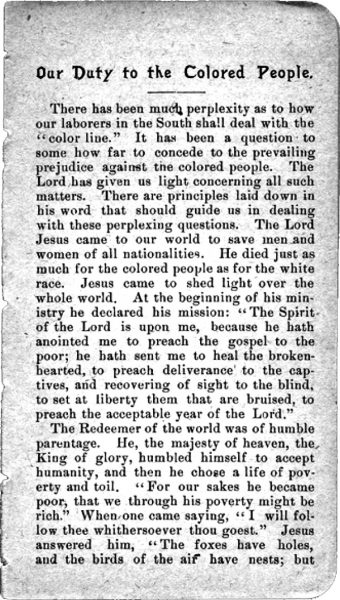 “Let the colored people work chiefly for those of their own race.... The best thing will be to provide the colored people who accept the truth, with places of worship of their own, in which they can carry on their services by themselves.… Schools and sanitariums for colored people should be established.”1