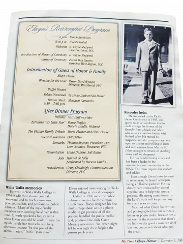 Over the years, Elwyn did communications work for Hinsdale Hospital near Chicago, Southeastern California Conference, Voice of Prophecy, Walla Walla University, and Oregon Conference before settling long term in Simi Valley, California, while editing the Recorder.