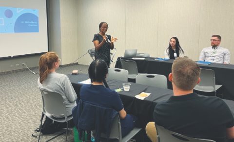 Sidany presents a devotional message for a group of students at Adventist Health Portland.