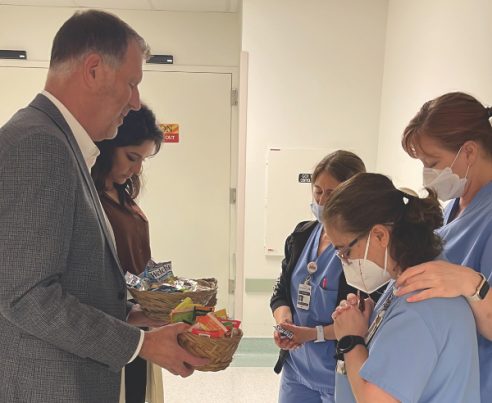 Chaplains at Adventist Health Glendale begin meeting with patients. As they make rounds, they also check on hospital staff. Supporting the well-being of nurses and other care providers is an important part of chaplaincy and a key element in helping healthcare providers bring the best possible care to patients. Through interactions with the Spiritual Care team, nurses and other staff members also learn about ways chaplains can help patients and family members who are struggling.